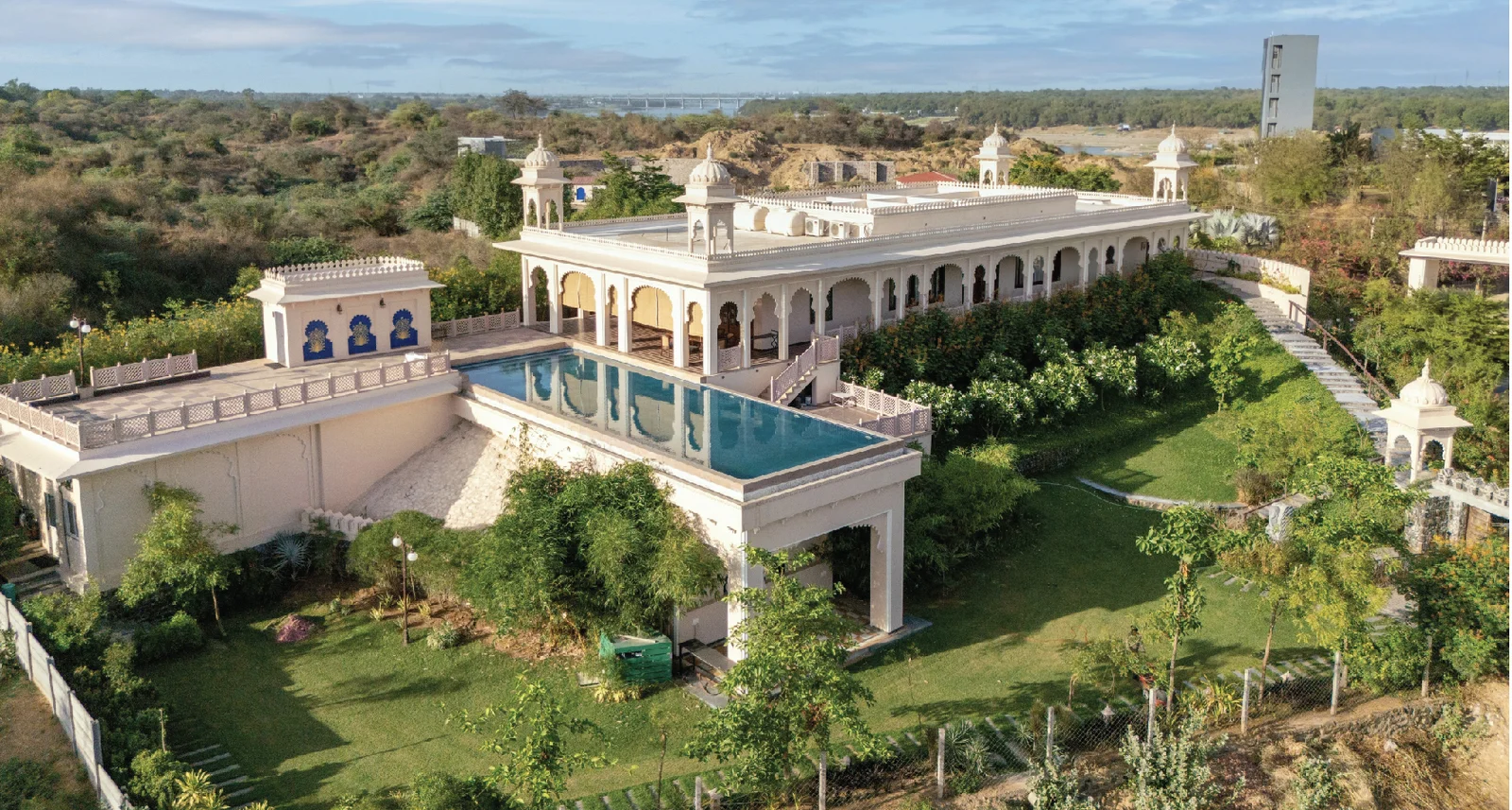 Set across nearly 200 acres, Aries Jagnivas is a royal-style resort offering a blend of modern architecture and traditional charm. With manicured lawns, spacious villas, and a grand pool, it’s perfect for families, weddings, or a luxurious weekend.